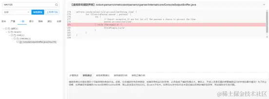用Wukong软件检测上述程序代码,则可以发现代码中存在着“通用异常捕获声明” 导致的代码缺陷,如下图: