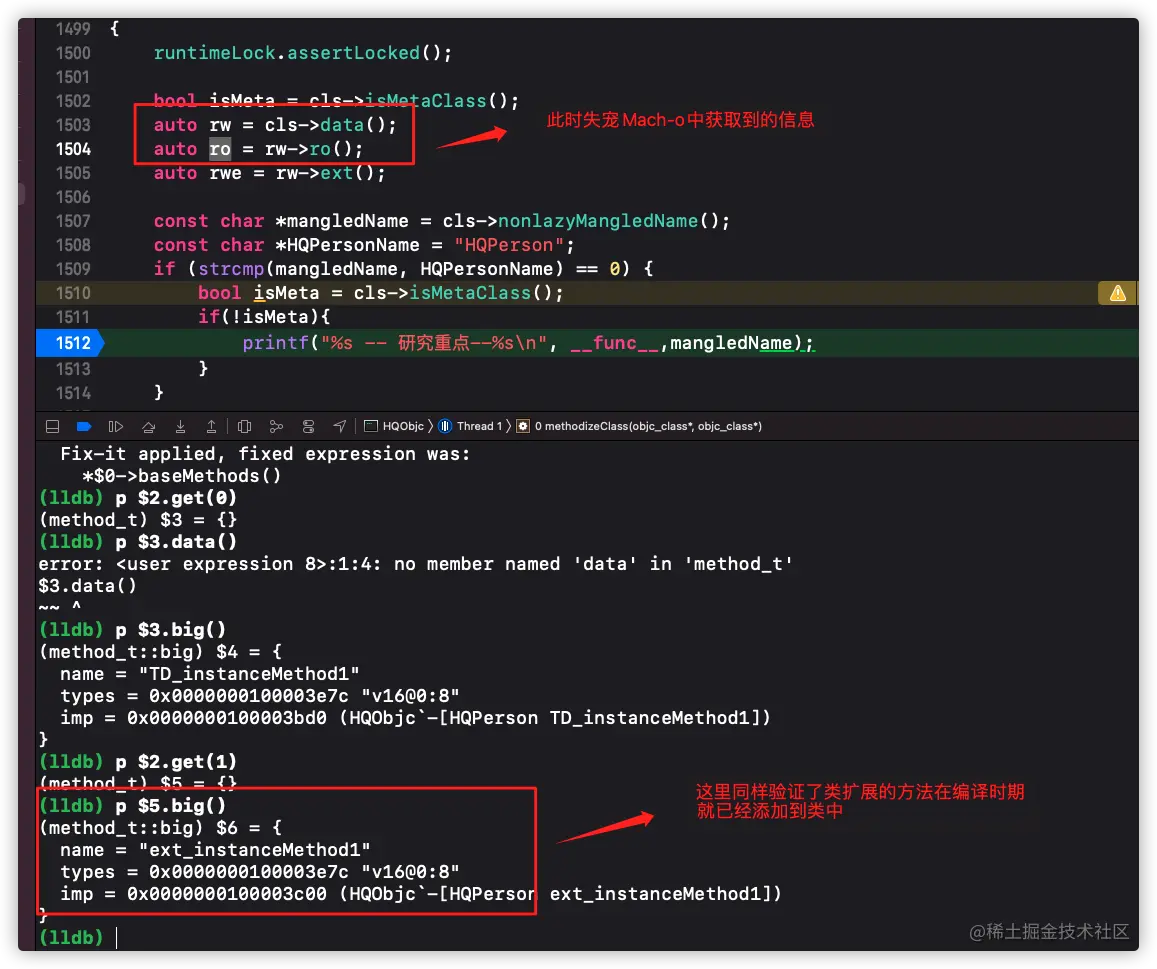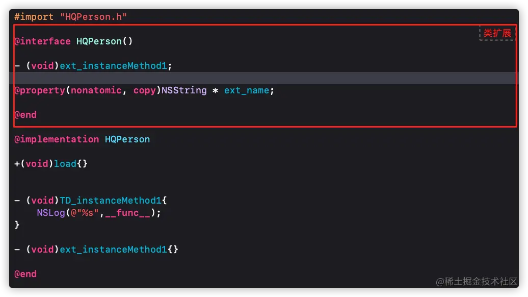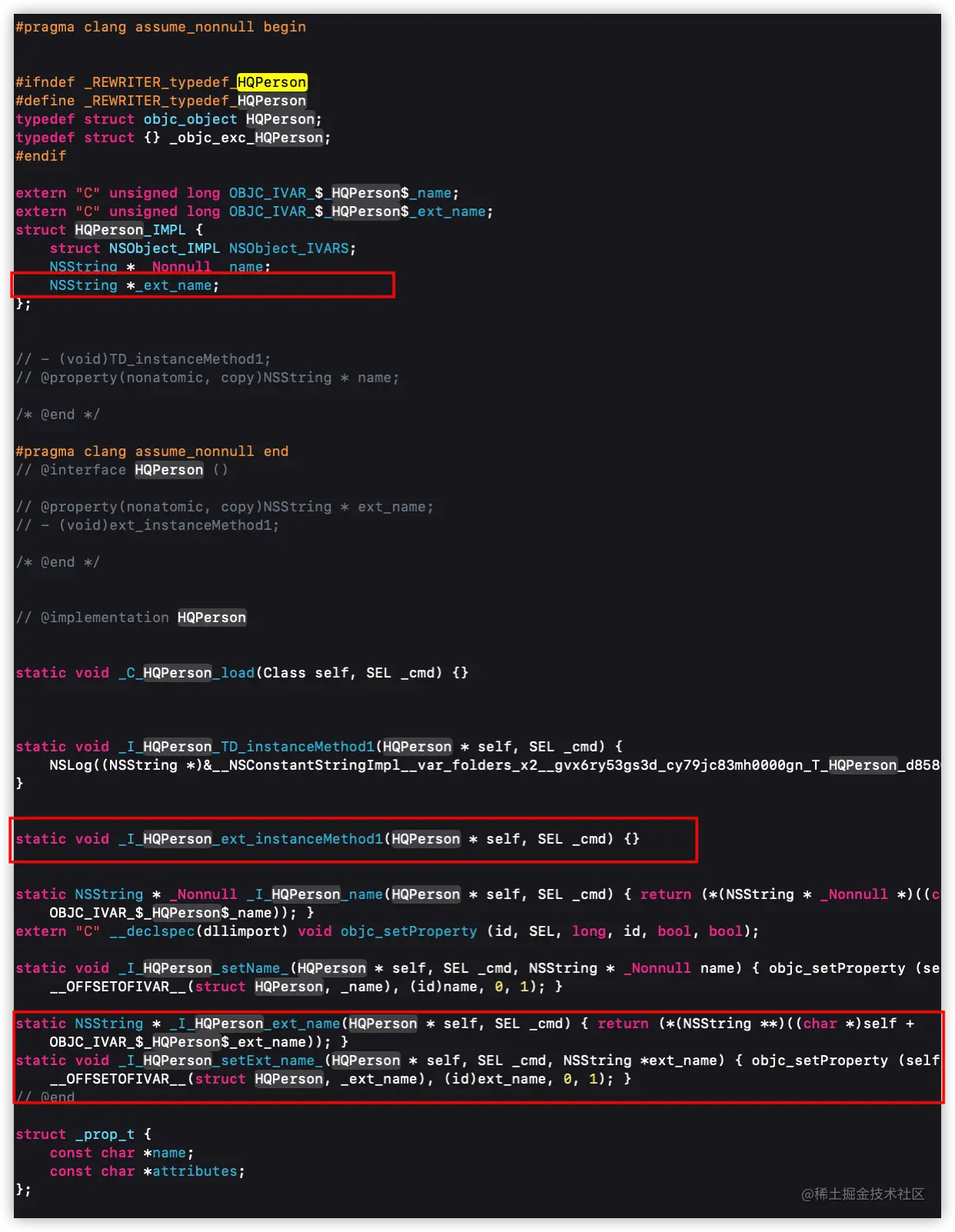 添加类扩展后clong对应文件编译查看编译后的文件clang -rewrite-objc main.m -o main.cpp发现编译时期就已经类扩展中的成员属性和方法添加到类中了,也可以运行源码验证