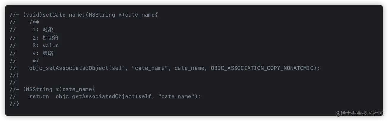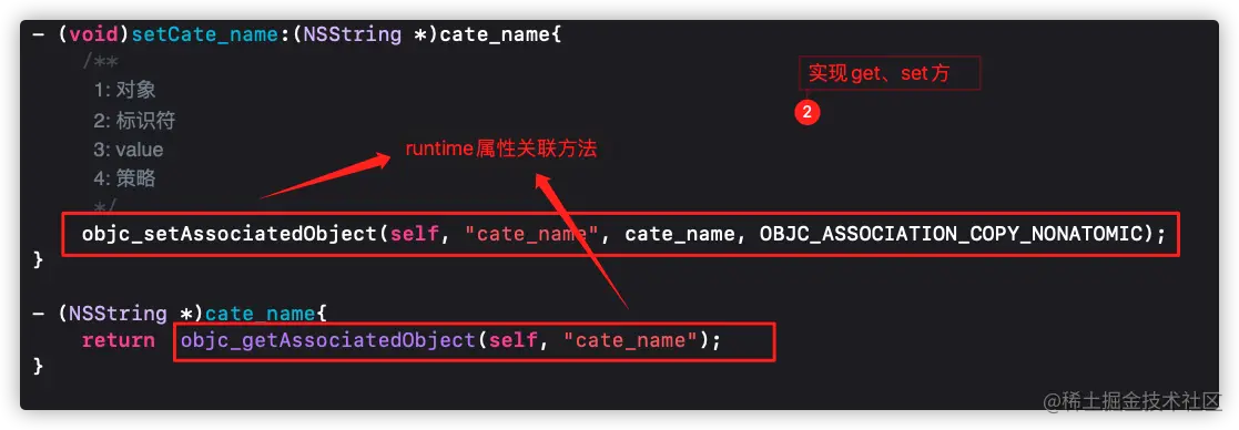 实现setter和getter方法分别通过objc_setAssociatedObject设置和objc_getAssociatedObject方法取值如下:在运行发现
