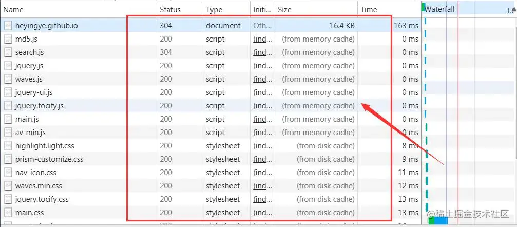 这里我们以博客的请求为例,状态码为灰色的请求则代表使用了强制缓存,请求对应的Size值则代表该缓存存放的位置,分别为from memory cache 和 from disk cache。那么from memory cache 和 from disk cache又分别代表的是什么呢?什么时候会使用from disk cache,什么时候会使用from memory cache呢?