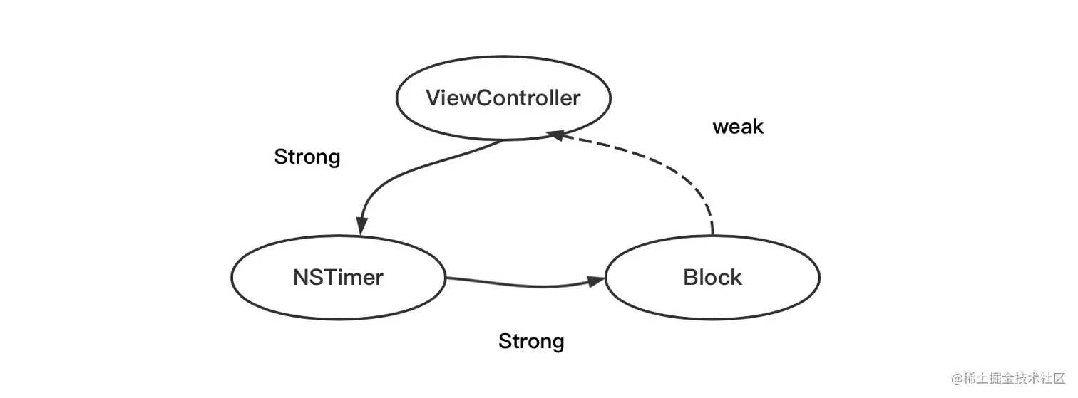 如果此时是在 UINavigationController 的层级中测试运行,可以看到 dealloc 方法不会调用,所以 ViewController 也就不会释放。这是因为 ViewController 和 NSTimer 互相强引用导致的。那么把 ViewController 声明为 weak 传入 NSTimer 初始化方法中能解决强引用问题吗?答案是不能,因为 NSTimer 的 timerWithTimeInterval 初始化方法里面还是会强引用 ViewController。