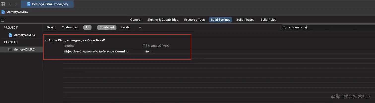 为了测试 MRC 的开发环境,如下图关闭 ARC 模式: