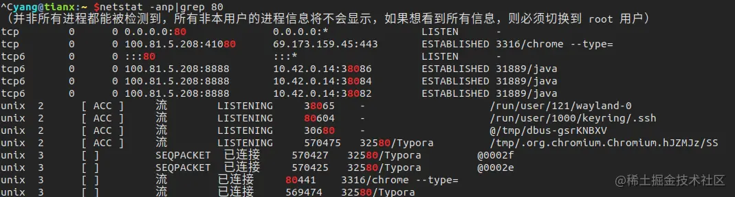 输出结果可以分为 Active Internet connections 和 Active UNIX domain sockets 两个部分