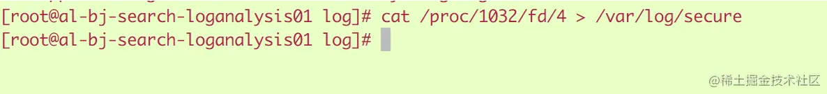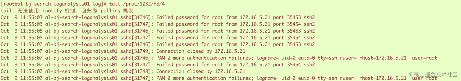c.从上面的信息可以看到 PID 1032(rsyslogd)打开文件的文件描述符为4。同时还可以看到/var/log/ secure已经标记为被删除了。因此我们可以在/proc/1032/fd/4(fd下的每个以数字命名的文件表示进程对应的文件描述符)中查看相应的信息,如下: