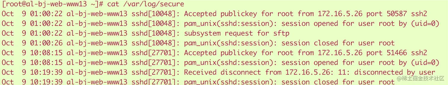 7.可以查看/var/log/secure日志文件,尝试发现入侵者的信息
