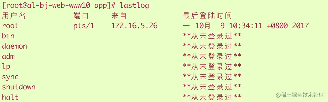 2.入侵者可能创建一个新的存放用户名及密码文件,可以查看/etc/passwd及/etc/shadow文件 3.查看机器最近成功登陆的事件和最后一次不成功的登陆事件,对应日志“/var/log/lastlog”