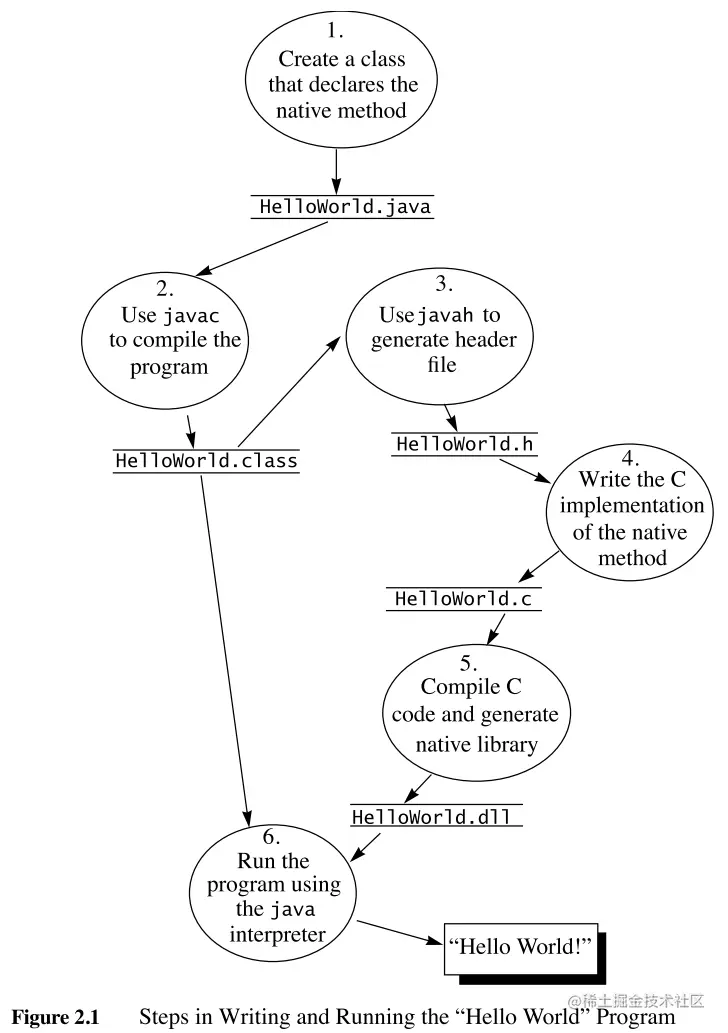- 使用 Java 运行时解析器运行 hello world 程序。类文件(HelloWorld.class)和本机库(HelloWorld.dll 或者 HelloWorld.so)都在运行时加载。 本章的剩余部分将详细讲解这些步骤。