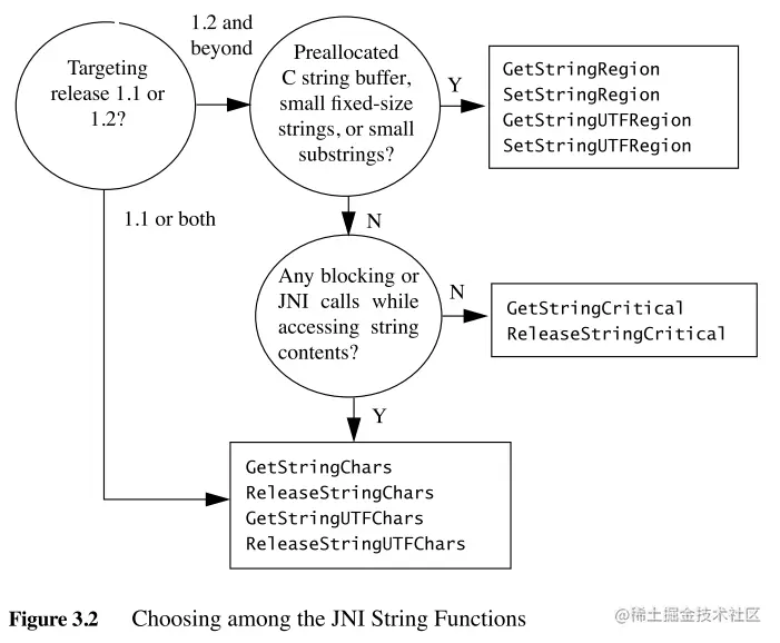在 JNI 中,可以按照类似于调用实例方法的那些步骤来来调用构造方法。要获取构造方法的方法 ID,在方法描述符中将“”作为方法名并且将“V”作为返回类型。然后你可以通过传递方法 ID 给 JNI 函数(例如 NewObject)来调用构造函数。以下代码实现了 JNI 函数 NewString 的等效功能,它从 Unicode 字符中创建一个 java.lang.String 对象并存储在一个 C 缓冲区中: