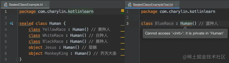 它的构造器默认就是 private 的,且不可修改,它的子类只能定义在同个 kt 文件中或者是密封类的内部类: