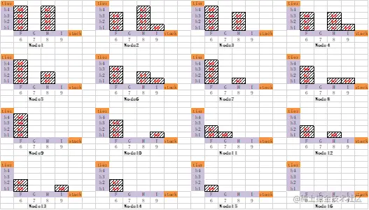 如图1所示为某一贝位内的堆存状态(6*6的贝位,且均为20FT集装箱,底部横轴为栈编号,左侧纵轴为层编号);当提箱顺序为C21->C15->C12时,可知当前堆存状态的目标箱位C21,C12处于栈顶,不存在阻塞箱,可直接发出;而C15作为后续堆存状态的目标箱,其上方还有其他集装箱;此时,定义C12,C13,C14为目标箱C15的阻塞箱,同时C12,C13,C14称为当前堆存状态的必翻箱;