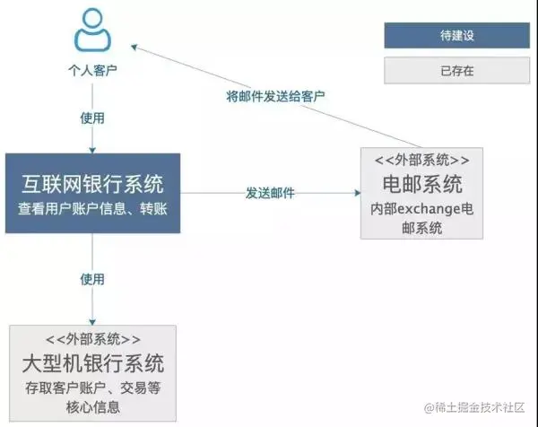 这是一个想象的待建设的互联网银行系统,它使用外部的大型机银行系统存取客户账户、交易信息,通过外部电邮系统给客户发邮件。