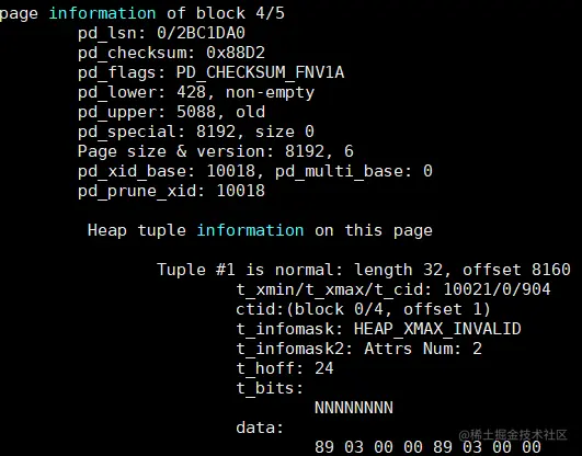 (2)除了系统表,另外一个常用的数据类型就是行存表的文件,通常对于存储异常、读取异常等问题,我们都需要通过pagehack查询行存表的头文件信息。首先连接DN上,查询到该行存表对应的relfilenode(16502),到对应DN的data目录下,执行:pagehack -f 16502 -t heap,结果如下: