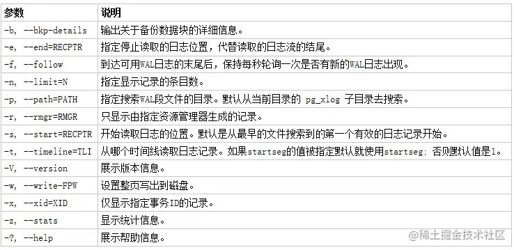 Pg_xlogdump参数使用说明如下: