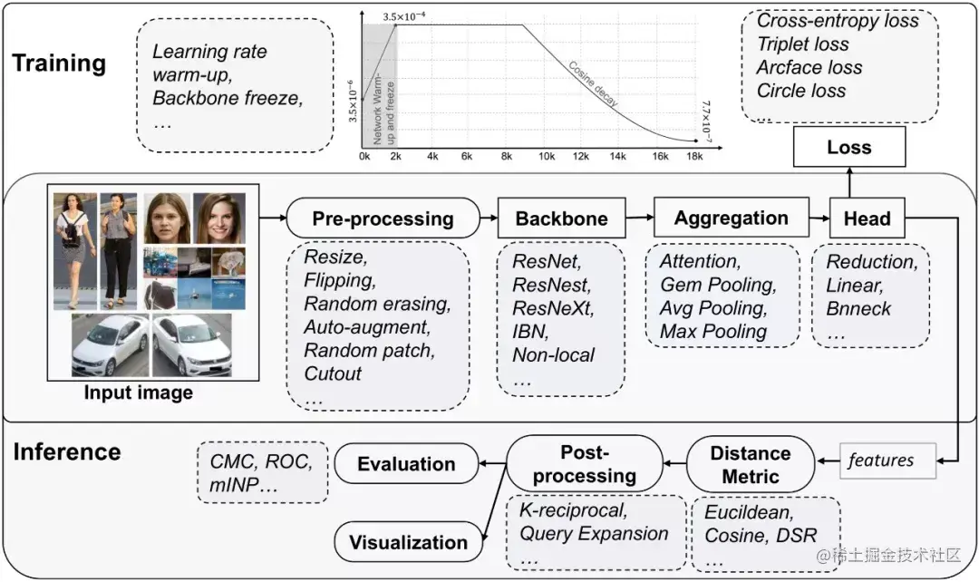 下图,完整列出了FastReID各个模块,上下分别为训练和推理。训练阶段包括模块: 图像预处理(Preprocssing)、骨干网(Backbone)、聚合模块(Aggregation)、Head 模块、训练策略、损失函数; 在推理阶段包含模块:度量部分,以及度量后处理指对检索结果的处理,包括K-reciprocal coding和 Query Expansion (QE) 两种重排序方法。