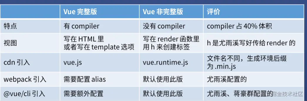 - 非完整版:无compiler,不能直接将html变成节点。webpack通过vue-loader将html变成h('div',this.h)