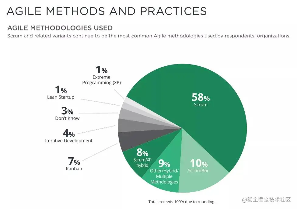 结合2020年度敏捷状态报告的一份数据,可以看出在所有敏捷实践中,Scrum和极限编程占绝对优势。