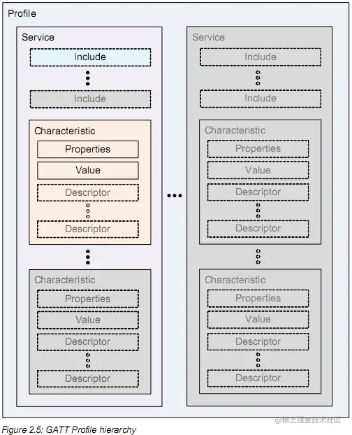 GATT按照层级定义了4个概念:Profile(配置文件)、Service(服务)、Characteristic(特征)和Descriptor(描述)。他们之间的关系是这样的:Profile定义了一个实际的场景,一个Profile包含多个Service,一个Service包含多个Characteristic,一个Characteristic可以包含多个Descriptor。