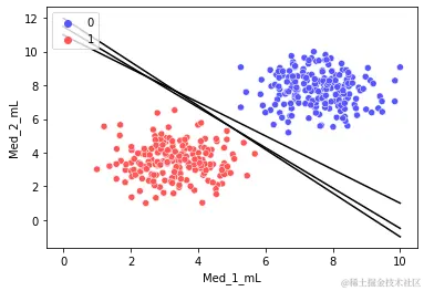 如上图,三条黑色直线都可以完美分割数据集。由此可知,我们仅用单一直线可以得到无数个解。那么,其中怎样的直线是最优的呢?