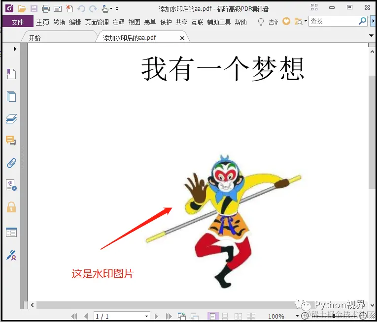 这里有一点需要注意:进行pdf合并的时候,我们希望“水印”在下面,文字在上面,因此是“水印”.mergePage(“图片页”)
