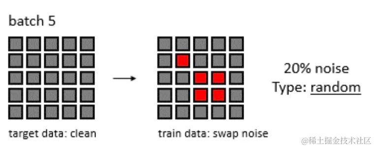 1. 列交换噪声(Columnwise swap noise): The idea of columwise noise is to noise only 20% of the batch by touching only full columns (check the animation below).