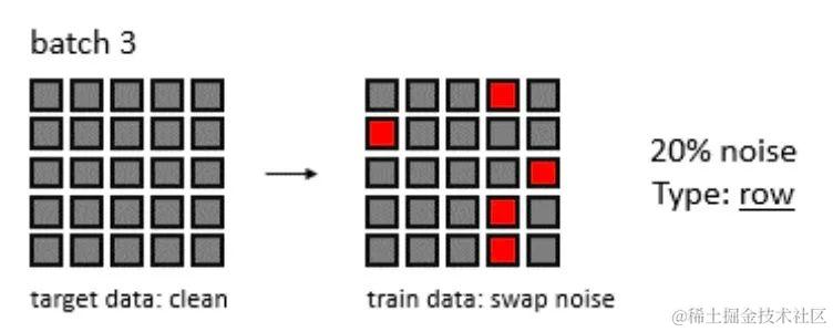 3. 行交换噪声(rowwise swap noise):As the name indicates rowwise noise replaces 20% of data so that each and every row is beeing transformed by a certain amount of noise.
