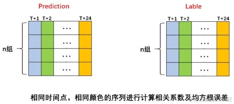 评分细则说明:根据所提供的n个测试数据,对模型进行测试,得到n组未来1-24个月的序列选取对应预测时效的n个数据与标签值进行计算相关系数和均方根误差,如下图所示。并计算得分。计算公式为: