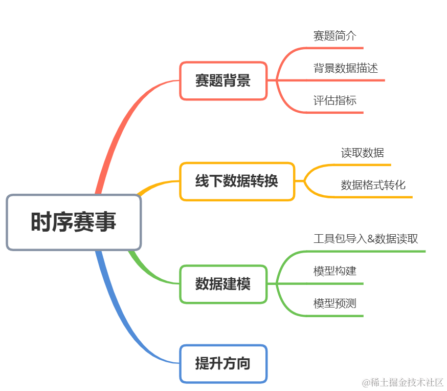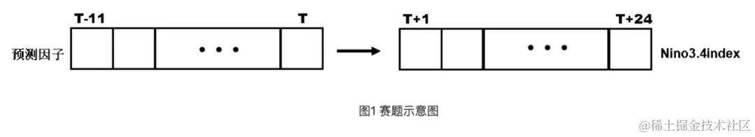 本次赛题是一个时间序列预测问题。基于历史气候观测和模式模拟数据,利用T时刻过去12个月(包含T时刻)的时空序列(气象因子),构建预测ENSO的深度学习模型,预测未来1-24个月的Nino3.4指数,如下图所示: