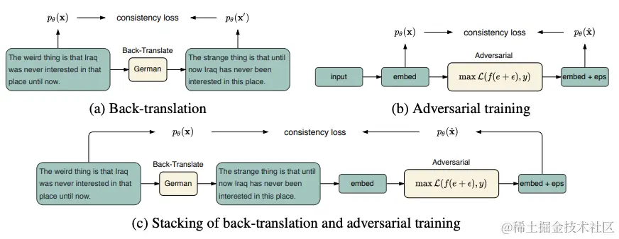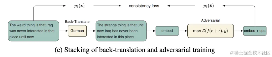 back-translate(回译)很容易理解,如上图,英语翻译成德语又翻译回英语,作为训练样本。\