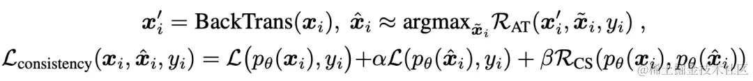 先用xi做回译得到xi',然后找到模型最难分辨的对抗样本,最后计算原样本和对抗样本的loss。我们可以看到loss有3项,第一项就是正常的交叉熵,第二项是对抗loss,第三项是一致性的loss,即样本和对抗样本理应相似度较高,这里RCS定义如下:\