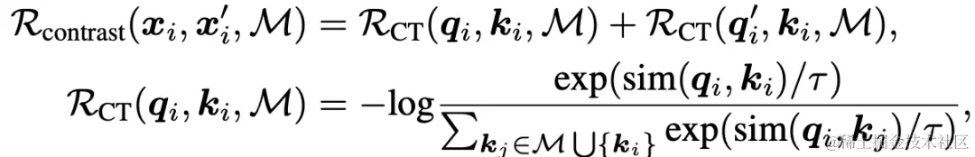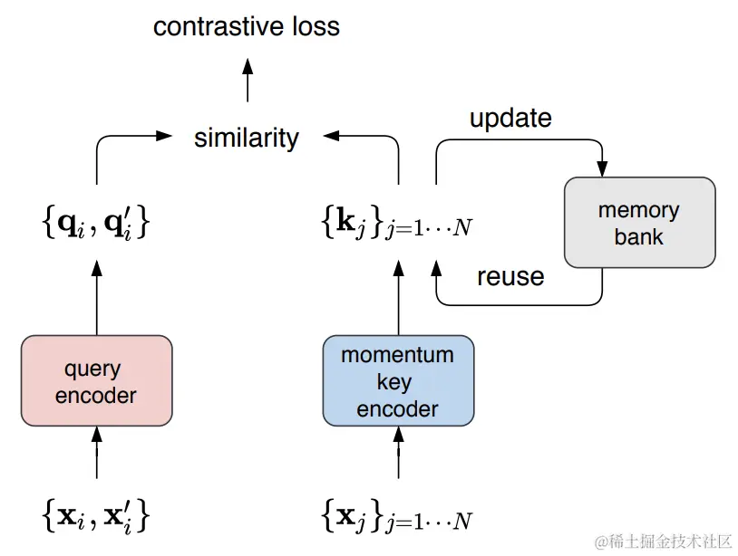 其中t是温度,M就是memory bank,该式表达的意思也很简单,就是样本xi和增强样本xi'和momentum key encoder产出的ki的相似度,要高于memory bank的负样本。和之前的loss一整合,就成了我们最终的学习目标:\