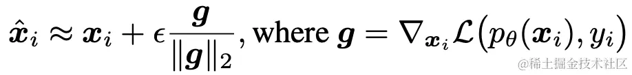 其实就是要找到模型认为相似的样本加入到模型中训练,但是在实际使用时,我们很难获得准确的对抗样本,因此可以用模型梯度构建相似的对抗样本,如下公式所示:\