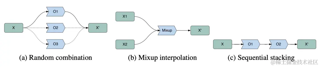 这3种其实没啥好说的,字面意思。(a)就是在一个mini-batch中,采用一个随机的数据增强方法把x变为x',(c)就是把x用一系列的数据增强方法变成x'。(b)是混合插值,是对两个样本的embedding ei和ej做操作,其中a是符合beta分布。\