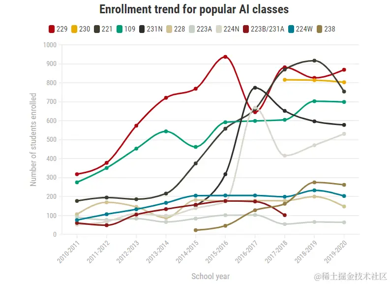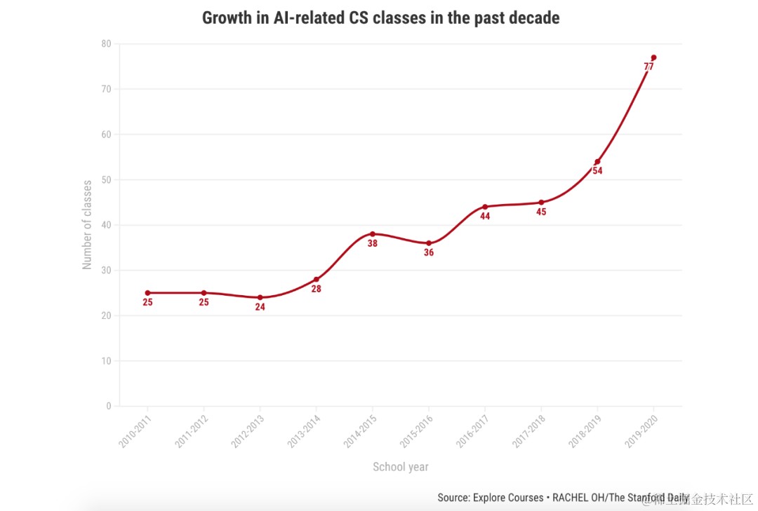 为了分析斯坦福在过去十年中的变化,Stanford Daily 的数据团队分析了过去 10 年 AI 相关计算机科学课程的数据变化,以探究其演变过程。