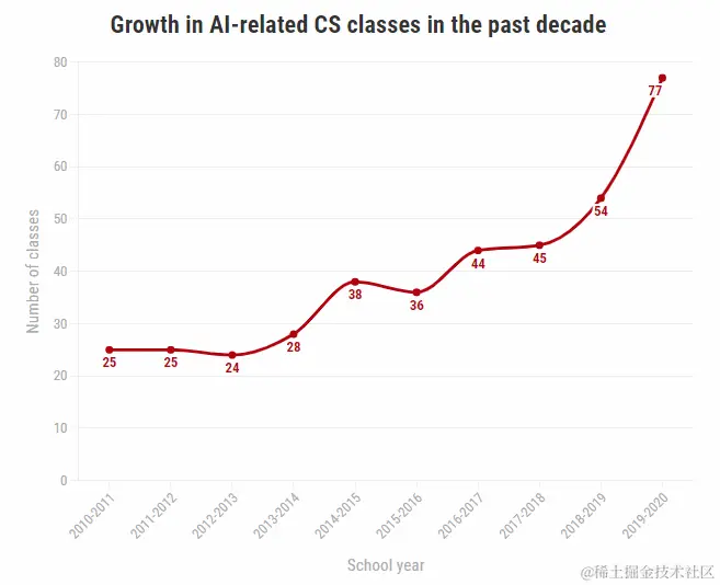 在过去的 10 年中,与 AI 相关的计算机科学课程总数从 25 个增加到 77 个,增长了两倍多。2014 年课程数量首次跃升后,从 2015 年开始,课程数量一直呈稳定增长,2018 年至 2020 年,增长速度达到最大。
