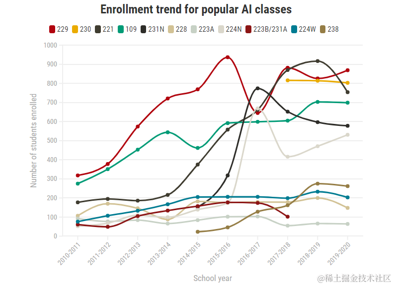 下图为 2010-2020 年受欢迎 AI 课程的注册人数发展趋势:
