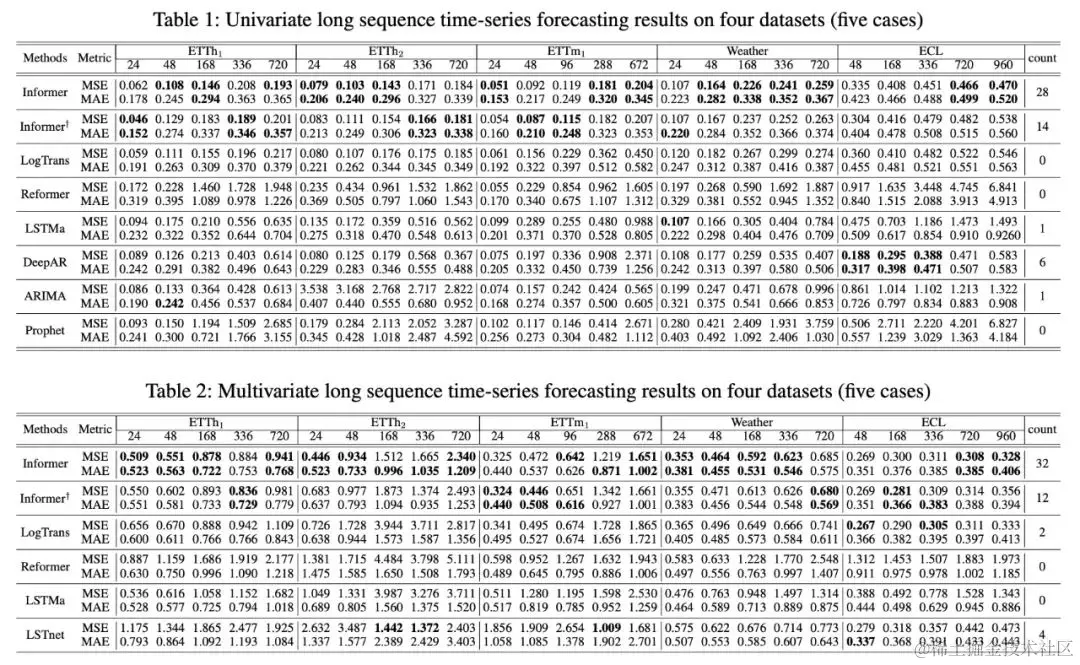- 所提出的模型Informer极大地提高了所有数据集的推理效果(最后一列的获胜计数),并且在不断增长的预测范围内,它们的预测误差平稳而缓慢地上升。