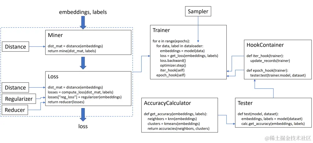 PyTorch Metric Learning能够让你以最轻松的方式在你的机器学习代码中融入深度度量学习,并且容易模块化、高度的灵活性和可拓展性。PML 9大模块如下图所示。