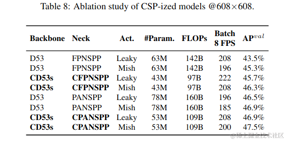 从表2所示的图中可以看出,将上述CNNs转换为CSPNet后,新的架构可以有效地减少ResNet、ResNeXt和Darknet上的计算量(FLOPs),分别减少23.5%、46.7%和50.0%。因此,我们使用CSP-ized的模型作为执行模型伸缩的最佳模型。\