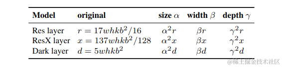 或者是具有b基层通道的k层CNNs, ResNet层的计算是k∗{conv1×1,b/4 - conv3×3,b/4 - conv1×1,b}, ResNext层的计算是k∗{conv1×1,b/2 - gconv3×3/32,b/2 - conv1×1,b}。暗网层的计算量为k∗{conv1×1,b/2 - conv3×3,b}。将可用于调整图像大小、层数和通道数的缩放因子分别设置为:当这些比例因子发生变化时,FLOPs的相应变化见表1。\