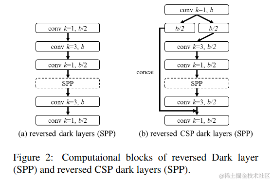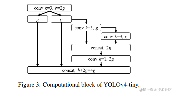 我们将使用PCB架构的CSPOSANet来构成YOLOv4的主干。我们设g=b/2为增长率,最终使其增长到b/2 +kg= 2bat。通过计算,我们得到k= 3,其结构如图3所示。对于每个阶段的通道数量和颈部部分,我们采用yolov3 -tiny的设计。