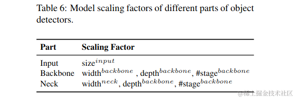 由于希望在对CNN模型进行缩放后提高准确性并保持实时推理速度,所以在进行复合缩放时,必须在目标检测器众多的缩放因子中找到最佳的组合。通常,我们可以调整对象检测器的输入、主干和颈部的比例因子。表6总结了可以调整的潜在缩放因子。\