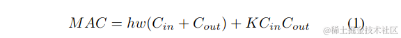 在评估低端设备的计算成本时,还必须考虑功耗,影响功耗的最大因素是内存访问成本(MAC)。通常一个卷积运算的MAC计算方法如下:\