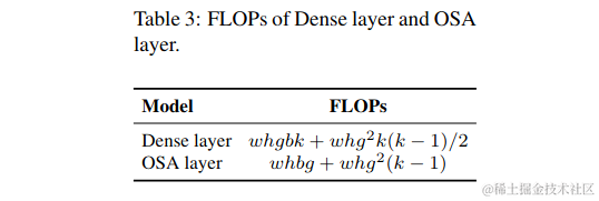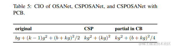 CIO是一个可以测量DRAM IO状态的指示器。表5列出了OSA、CSP和我们设计的CSP OSANet的CIO。当kg > b/2时,提出的CSP OSANet可以获得最佳的CIO。\
