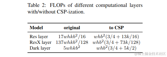 由表1可以看出,尺度大小、深度和宽度都会导致计算成本的增加。它们分别表现为平方增长、线性增长和平方增长。CSPNet可以应用于各种CNN架构,同时减少了参数和计算量。此外,它还提高了准确性,减少了推理时间。我们将它应用到ResNet、ResNeXt和Darknet中,观察计算量的变化,如表2所示。\