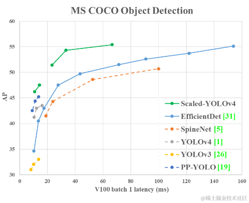 CSPDarknet53的深度、瓶颈比、龄期间宽度生长比分别为65、1和2。因此,我们开发了基于YOLOv4的模型缩放技术,提出了scale -YOLOv4。提出的缩放yolov4具有出色的性能,如下图所示。\