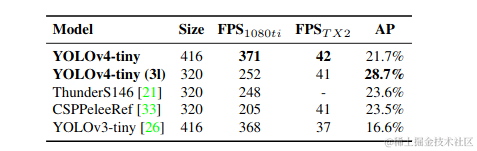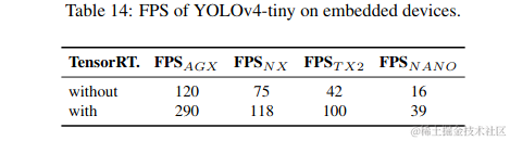 YOLOv4-tiny模型在RTX 2080Ti上以443 FPS的速度实现了22.0%的AP(42.0%AP50),而使用TensorRT,批处理大小= 4和FP16精度,YOLOv4-tiny的模型实现了1774 FPS。\