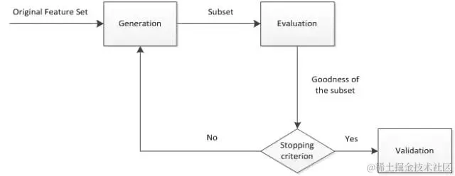 (1) 产生过程( Generation Procedure )是搜索特征子集的过程,首先从特征全集中产生出一个特征子集。搜索方式有完全搜索(如广度优先搜索、定向搜索)、启发式搜索(如双向搜索、后向选择)、随机搜索(如随机子集选择、模拟退火、遗传算法)。(2) 评价函数( Evaluation Function ) 是评价一个特征子集好坏程度的一个准则。(3) 停止准则( Stopping Criterion )停止准则是与评价函数相关的,一般是一个阈值,当评价函数值达到这个阈值后就可停止搜索。(4) 验证过程( Validation Procedure )是在验证数据集上验证选出来的特征子集的实际效果。首先从特征全集中产生出一个特征子集,然后用评价函数对该特征子集进行评价,评价的结果与停止准则进行比较,若评价结果比停止准则好就停止,否则就继续产生下一组特征子集,继续进行特征选择。最后选出来的特征子集一般还要验证其实际效果。