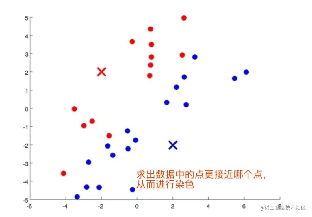 - 首先我们需要确定一个k值(随机),即我们希望数据经过聚类得到k个不同的集合;