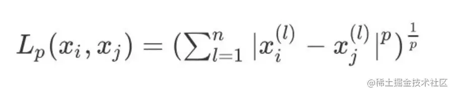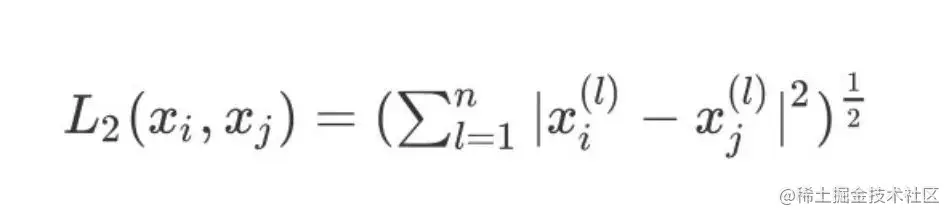 3、当 p=2 则表示为我们常用的欧式距离: