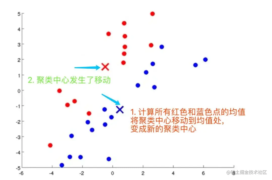 4、计算2个数据集的各自的质心(红点、蓝点的均值),将聚类中心移动到均值处,变成新的聚类中心